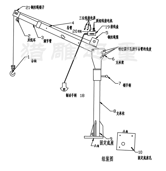1、 選擇車載小吊機(jī)合適的安裝位置,將底座(9)固定好;